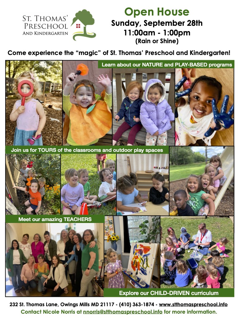 Staff and teachers welcome you to St. Thomas Preschool. At STPS we foster a love of learning by supporting children’s natural curiosity, perseverance, confidence and risk taking through play and activities in nature. Please be sure to thoroughly read through the Parent Handbook so that you have a full understanding of our school policies and guidelines. If you have any further questions, please contact the office staff or your classroom teacher.